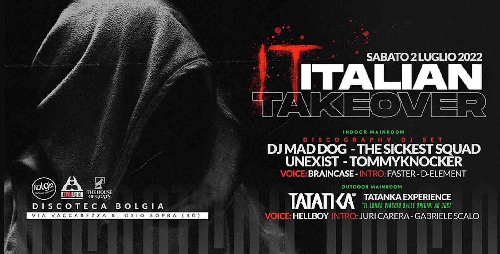 Italian Takeover arriva a circa due mesi da Evolution Of Hardcore vs Official Party Dylan, a suggellare quello che per il top club di Bergamo è ormai un legame consolidato con la musica elettronica di ogni genere.Bolgia il 2 luglio 2022 per l’evento Italian Takeover apre alle ore 23.00 e si balla fino alle 5 del mattino.